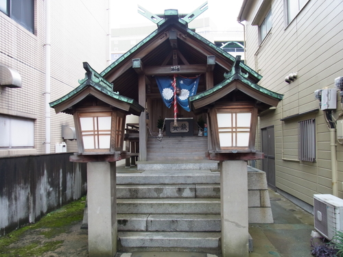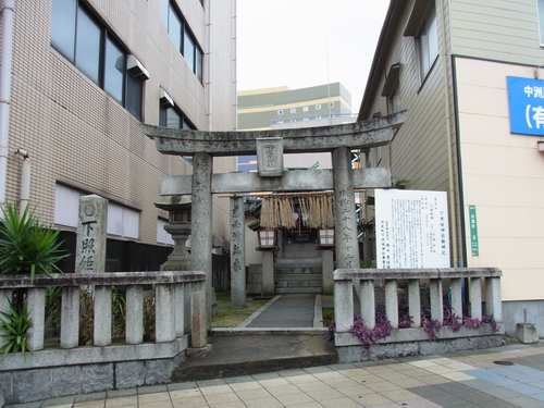 福岡県福岡市博多区祇園町、博多区役所と大きな商業施設キャナルシティ博多の間の地に鎮座。